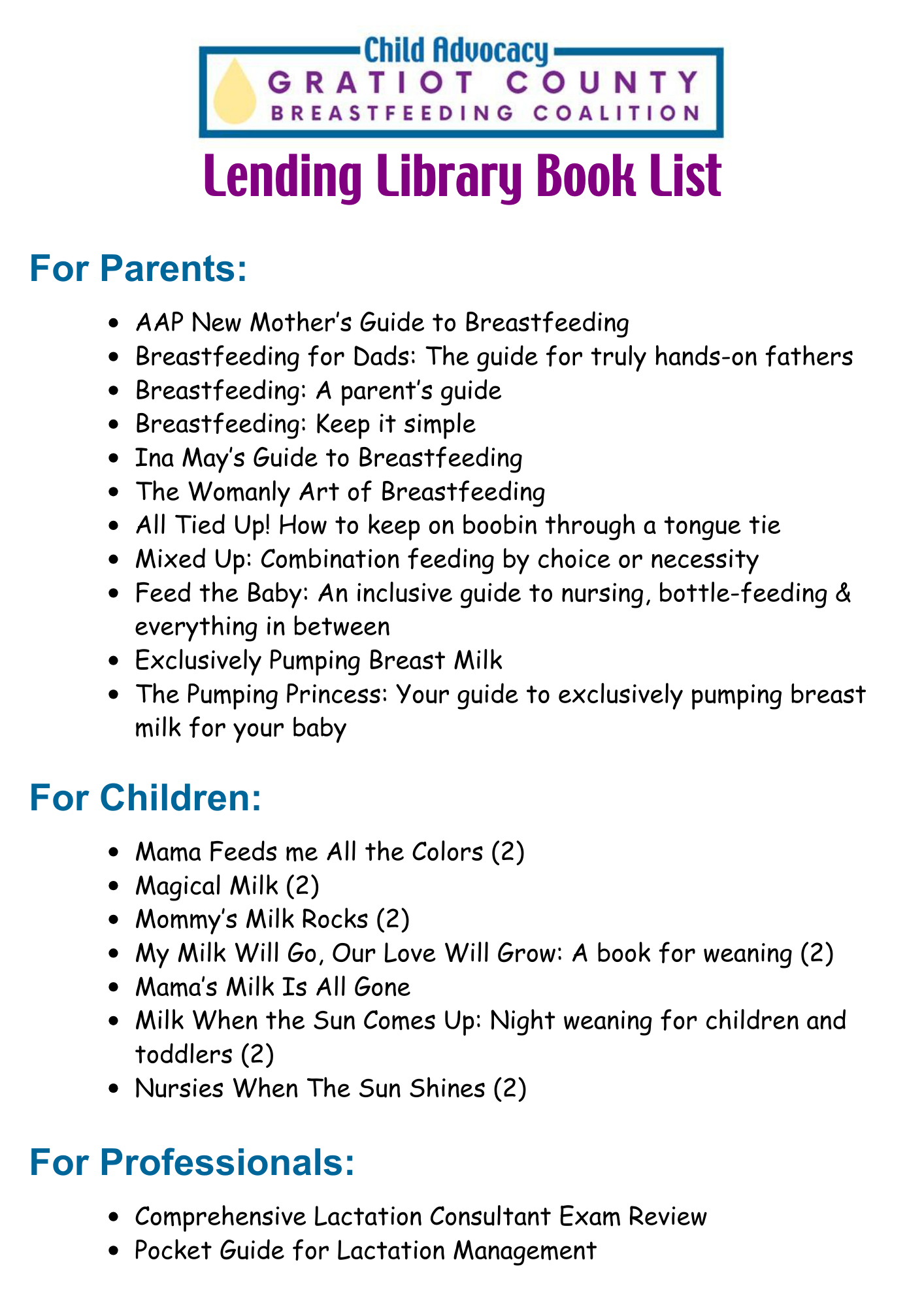 Email amanda@childadvocacy.net or call Child Advocacy (989)463-1422 for more information on checking out books from our Lending Library!
